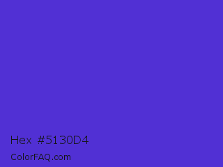 Hex #5130d4 Color is a normal indigo color and the nearest color is Purple Heart Crayola #652dc1. Hex code #5130d4 and RGB value is rgb(81,48,212). In RGB color space, this color is composed of 32% red, 19% green, 83% blue, In CMYK color space, this color is composed of 62% cyan, 77% magenta, 0% yellow , 17% black , In HSL color space, this color has a hue angle of 252° , 66% saturation and 51% lightness.
