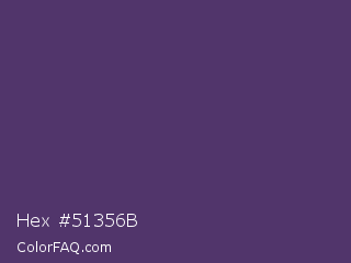 Hex #51356b Color is a normal purple color and the nearest color is Imperial #602f6b. Hex code #51356b and RGB value is rgb(81,53,107). In RGB color space, this color is composed of 32% red, 21% green, 42% blue, In CMYK color space, this color is composed of 24% cyan, 50% magenta, 0% yellow , 58% black , In HSL color space, this color has a hue angle of 271° , 34% saturation and 31% lightness.