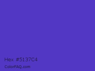 Hex #5137c4 Color is a normal indigo color and the nearest color is Ocean Blue #4f42b5. Hex code #5137c4 and RGB value is rgb(81,55,196). In RGB color space, this color is composed of 32% red, 22% green, 77% blue, In CMYK color space, this color is composed of 59% cyan, 72% magenta, 0% yellow , 23% black , In HSL color space, this color has a hue angle of 251° , 56% saturation and 49% lightness.