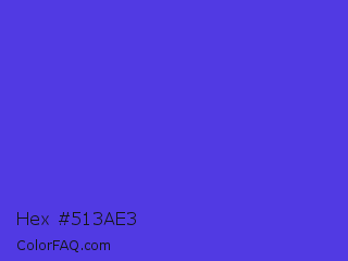 Hex #513ae3 Color is a normal indigo color and the nearest color is Majorelle Blue #6050dc. Hex code #513ae3 and RGB value is rgb(81,58,227). In RGB color space, this color is composed of 32% red, 23% green, 89% blue, In CMYK color space, this color is composed of 64% cyan, 74% magenta, 0% yellow , 11% black , In HSL color space, this color has a hue angle of 248° , 75% saturation and 56% lightness.