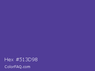 Hex #513d98 Color is a normal indigo color and the nearest color is Gigas #523c94. Hex code #513d98 and RGB value is rgb(81,61,152). In RGB color space, this color is composed of 32% red, 24% green, 60% blue, In CMYK color space, this color is composed of 47% cyan, 60% magenta, 0% yellow , 40% black , In HSL color space, this color has a hue angle of 253° , 43% saturation and 42% lightness.