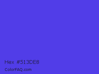 Hex #513de8 Color is a normal indigo color and the nearest color is Majorelle Blue #6050dc. Hex code #513de8 and RGB value is rgb(81,61,232). In RGB color space, this color is composed of 32% red, 24% green, 91% blue, In CMYK color space, this color is composed of 65% cyan, 74% magenta, 0% yellow , 9% black , In HSL color space, this color has a hue angle of 247° , 79% saturation and 57% lightness.