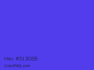 Hex #513deb Color is a normal indigo color and the nearest color is Majorelle Blue #6050dc. Hex code #513deb and RGB value is rgb(81,61,235). In RGB color space, this color is composed of 32% red, 24% green, 92% blue, In CMYK color space, this color is composed of 66% cyan, 74% magenta, 0% yellow , 8% black , In HSL color space, this color has a hue angle of 247° , 81% saturation and 58% lightness.