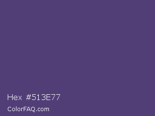 Hex #513e77 Color is a normal indigo color and the nearest color is Cyber Grape #58427c. Hex code #513e77 and RGB value is rgb(81,62,119). In RGB color space, this color is composed of 32% red, 24% green, 47% blue, In CMYK color space, this color is composed of 32% cyan, 48% magenta, 0% yellow , 53% black , In HSL color space, this color has a hue angle of 260° , 31% saturation and 35% lightness.