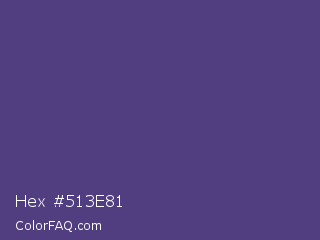 Hex #513e81 Color is a normal indigo color and the nearest color is Cyber Grape #58427c. Hex code #513e81 and RGB value is rgb(81,62,129). In RGB color space, this color is composed of 32% red, 24% green, 51% blue, In CMYK color space, this color is composed of 37% cyan, 52% magenta, 0% yellow , 49% black , In HSL color space, this color has a hue angle of 257° , 35% saturation and 37% lightness.