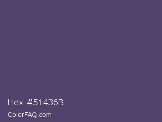 Hex #51436b Color is a normal violet color and the nearest color is Mulled Wine #4e4562. Hex code #51436b and RGB value is rgb(81,67,107). In RGB color space, this color is composed of 32% red, 26% green, 42% blue, In CMYK color space, this color is composed of 24% cyan, 37% magenta, 0% yellow , 58% black , In HSL color space, this color has a hue angle of 261° , 23% saturation and 34% lightness.