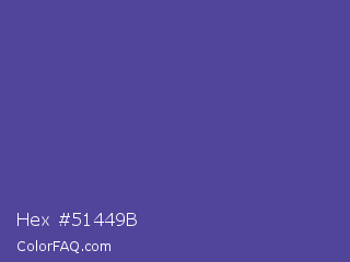 Hex #51449b Color is a normal indigo color and the nearest color is Victoria #534491. Hex code #51449b and RGB value is rgb(81,68,155). In RGB color space, this color is composed of 32% red, 27% green, 61% blue, In CMYK color space, this color is composed of 48% cyan, 56% magenta, 0% yellow , 39% black , In HSL color space, this color has a hue angle of 249° , 39% saturation and 44% lightness.
