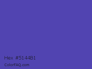 Hex #5144b1 Color is a normal indigo color and the nearest color is Ocean Blue #4f42b5. Hex code #5144b1 and RGB value is rgb(81,68,177). In RGB color space, this color is composed of 32% red, 27% green, 69% blue, In CMYK color space, this color is composed of 54% cyan, 62% magenta, 0% yellow , 31% black , In HSL color space, this color has a hue angle of 247° , 44% saturation and 48% lightness.