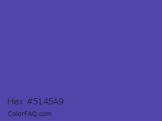 Hex #5145a9 Color is a normal indigo color and the nearest color is Plump Purple #5946b2. Hex code #5145a9 and RGB value is rgb(81,69,169). In RGB color space, this color is composed of 32% red, 27% green, 66% blue, In CMYK color space, this color is composed of 52% cyan, 59% magenta, 0% yellow , 34% black , In HSL color space, this color has a hue angle of 247° , 42% saturation and 47% lightness.