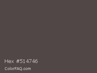 Hex #514746 Color is a dark red color and the nearest color is Emperor #514649. Hex code #514746 and RGB value is rgb(81,71,70). In RGB color space, this color is composed of 32% red, 28% green, 27% blue, In CMYK color space, this color is composed of 0% cyan, 12% magenta, 14% yellow , 68% black , In HSL color space, this color has a hue angle of 5° , 7% saturation and 30% lightness.