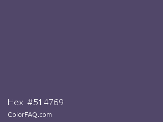 Hex #514769 Color is a normal indigo color and the nearest color is Mulled Wine #4e4562. Hex code #514769 and RGB value is rgb(81,71,105). In RGB color space, this color is composed of 32% red, 28% green, 41% blue, In CMYK color space, this color is composed of 23% cyan, 32% magenta, 0% yellow , 59% black , In HSL color space, this color has a hue angle of 258° , 19% saturation and 35% lightness.