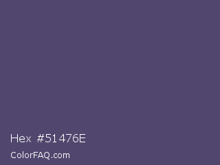 Hex #51476e Color is a normal indigo color and the nearest color is Independence #4c516d. Hex code #51476e and RGB value is rgb(81,71,110). In RGB color space, this color is composed of 32% red, 28% green, 43% blue, In CMYK color space, this color is composed of 26% cyan, 35% magenta, 0% yellow , 57% black , In HSL color space, this color has a hue angle of 255° , 22% saturation and 35% lightness.