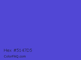 Hex #5147d5 Color is a normal indigo color and the nearest color is Iris #5a4fcf. Hex code #5147d5 and RGB value is rgb(81,71,213). In RGB color space, this color is composed of 32% red, 28% green, 84% blue, In CMYK color space, this color is composed of 62% cyan, 67% magenta, 0% yellow , 16% black , In HSL color space, this color has a hue angle of 244° , 63% saturation and 56% lightness.