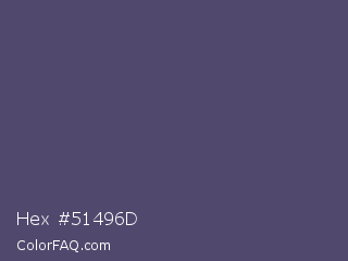 Hex #51496d Color is a normal indigo color and the nearest color is Independence #4c516d. Hex code #51496d and RGB value is rgb(81,73,109). In RGB color space, this color is composed of 32% red, 29% green, 43% blue, In CMYK color space, this color is composed of 26% cyan, 33% magenta, 0% yellow , 57% black , In HSL color space, this color has a hue angle of 253° , 20% saturation and 36% lightness.