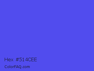 Hex #514cee Color is a light indigo color and the nearest color is Majorelle Blue #6050dc. Hex code #514cee and RGB value is rgb(81,76,238). In RGB color space, this color is composed of 32% red, 30% green, 93% blue, In CMYK color space, this color is composed of 66% cyan, 68% magenta, 0% yellow , 7% black , In HSL color space, this color has a hue angle of 242° , 83% saturation and 62% lightness.