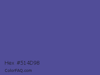 Hex #514d98 Color is a normal indigo color and the nearest color is Victoria #534491. Hex code #514d98 and RGB value is rgb(81,77,152). In RGB color space, this color is composed of 32% red, 30% green, 60% blue, In CMYK color space, this color is composed of 47% cyan, 49% magenta, 0% yellow , 40% black , In HSL color space, this color has a hue angle of 243° , 33% saturation and 45% lightness.