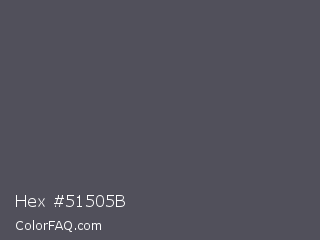 Hex #51505b Color is a normal indigo color and the nearest color is Abbey #4c4f56. Hex code #51505b and RGB value is rgb(81,80,91). In RGB color space, this color is composed of 32% red, 31% green, 36% blue, In CMYK color space, this color is composed of 11% cyan, 12% magenta, 0% yellow , 64% black , In HSL color space, this color has a hue angle of 245° , 6% saturation and 34% lightness.