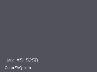 Hex #51525b Color is a normal blue color and the nearest color is Abbey #4c4f56. Hex code #51525b and RGB value is rgb(81,82,91). In RGB color space, this color is composed of 32% red, 32% green, 36% blue, In CMYK color space, this color is composed of 11% cyan, 10% magenta, 0% yellow , 64% black , In HSL color space, this color has a hue angle of 234° , 6% saturation and 34% lightness.