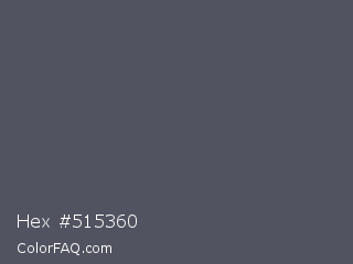 Hex #515360 Color is a normal blue color and the nearest color is Scarpa Flow #585562. Hex code #515360 and RGB value is rgb(81,83,96). In RGB color space, this color is composed of 32% red, 33% green, 38% blue, In CMYK color space, this color is composed of 16% cyan, 14% magenta, 0% yellow , 62% black , In HSL color space, this color has a hue angle of 232° , 8% saturation and 35% lightness.