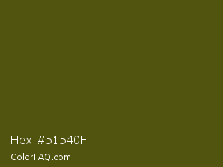 Hex #51540f Color is a very dark yellow color and the nearest color is Saratoga #555b10. Hex code #51540f and RGB value is rgb(81,84,15). In RGB color space, this color is composed of 32% red, 33% green, 6% blue, In CMYK color space, this color is composed of 4% cyan, 0% magenta, 82% yellow , 67% black , In HSL color space, this color has a hue angle of 63° , 70% saturation and 19% lightness.