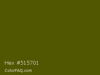 Hex #515701 Color is a very dark yellow color and the nearest color is Verdun Green #495400. Hex code #515701 and RGB value is rgb(81,87,1). In RGB color space, this color is composed of 32% red, 34% green, 0% blue, In CMYK color space, this color is composed of 7% cyan, 0% magenta, 99% yellow , 66% black , In HSL color space, this color has a hue angle of 64° , 98% saturation and 17% lightness.