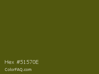 Hex #51570e Color is a very dark yellow color and the nearest color is Saratoga #555b10. Hex code #51570e and RGB value is rgb(81,87,14). In RGB color space, this color is composed of 32% red, 34% green, 5% blue, In CMYK color space, this color is composed of 7% cyan, 0% magenta, 84% yellow , 66% black , In HSL color space, this color has a hue angle of 65° , 72% saturation and 20% lightness.