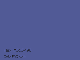 Hex #515a96 Color is a normal blue color and the nearest color is UCLA Blue #536895. Hex code #515a96 and RGB value is rgb(81,90,150). In RGB color space, this color is composed of 32% red, 35% green, 59% blue, In CMYK color space, this color is composed of 46% cyan, 40% magenta, 0% yellow , 41% black , In HSL color space, this color has a hue angle of 232° , 30% saturation and 45% lightness.
