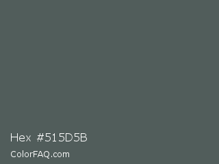 Hex #515d5b Color is a normal cyan color and the nearest color is Feldgrau #4d5d53. Hex code #515d5b and RGB value is rgb(81,93,91). In RGB color space, this color is composed of 32% red, 36% green, 36% blue, In CMYK color space, this color is composed of 13% cyan, 0% magenta, 2% yellow , 64% black , In HSL color space, this color has a hue angle of 170° , 7% saturation and 34% lightness.