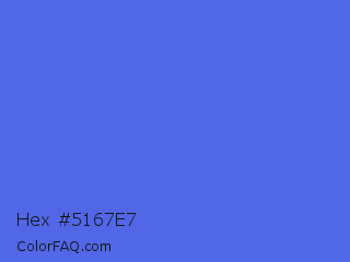 Hex #5167e7 Color is a light blue color and the nearest color is Royal Blue #4169e1. Hex code #5167e7 and RGB value is rgb(81,103,231). In RGB color space, this color is composed of 32% red, 40% green, 91% blue, In CMYK color space, this color is composed of 65% cyan, 55% magenta, 0% yellow , 9% black , In HSL color space, this color has a hue angle of 231° , 76% saturation and 61% lightness.