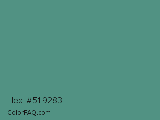 Hex #519283 Color is a normal cyan color and the nearest color is Wintergreen Dream #56887d. Hex code #519283 and RGB value is rgb(81,146,131). In RGB color space, this color is composed of 32% red, 57% green, 51% blue, In CMYK color space, this color is composed of 45% cyan, 0% magenta, 10% yellow , 43% black , In HSL color space, this color has a hue angle of 166° , 29% saturation and 45% lightness.