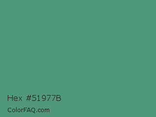 Hex #51977b Color is a normal green color and the nearest color is Wintergreen Dream #56887d. Hex code #51977b and RGB value is rgb(81,151,123). In RGB color space, this color is composed of 32% red, 59% green, 48% blue, In CMYK color space, this color is composed of 46% cyan, 0% magenta, 19% yellow , 41% black , In HSL color space, this color has a hue angle of 156° , 30% saturation and 45% lightness.