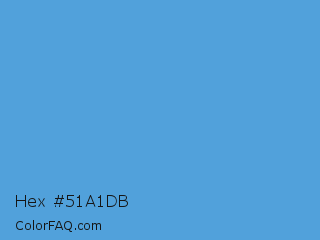 Hex #51a1db Color is a normal blue color and the nearest color is Carolina Blue #56a0d3. Hex code #51a1db and RGB value is rgb(81,161,219). In RGB color space, this color is composed of 32% red, 63% green, 86% blue, In CMYK color space, this color is composed of 63% cyan, 26% magenta, 0% yellow , 14% black , In HSL color space, this color has a hue angle of 205° , 66% saturation and 59% lightness.