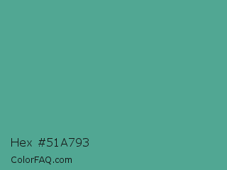 Hex #51a793 Color is a normal cyan color and the nearest color is Polished Pine #5da493. Hex code #51a793 and RGB value is rgb(81,167,147). In RGB color space, this color is composed of 32% red, 65% green, 58% blue, In CMYK color space, this color is composed of 51% cyan, 0% magenta, 12% yellow , 35% black , In HSL color space, this color has a hue angle of 166° , 35% saturation and 49% lightness.
