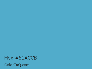 Hex #51accb Color is a normal blue color and the nearest color is Shakespeare #4eabd1. Hex code #51accb and RGB value is rgb(81,172,203). In RGB color space, this color is composed of 32% red, 67% green, 80% blue, In CMYK color space, this color is composed of 60% cyan, 15% magenta, 0% yellow , 20% black , In HSL color space, this color has a hue angle of 195° , 54% saturation and 56% lightness.