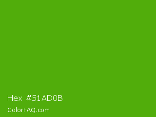 Hex #51ad0b Color is a normal green color and the nearest color is Kelly Green #4cbb17. Hex code #51ad0b and RGB value is rgb(81,173,11). In RGB color space, this color is composed of 32% red, 68% green, 4% blue, In CMYK color space, this color is composed of 53% cyan, 0% magenta, 94% yellow , 32% black , In HSL color space, this color has a hue angle of 94° , 88% saturation and 36% lightness.