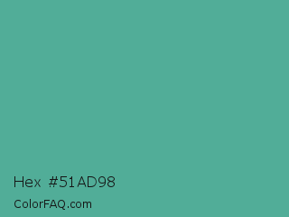 Hex #51ad98 Color is a normal cyan color and the nearest color is Polished Pine #5da493. Hex code #51ad98 and RGB value is rgb(81,173,152). In RGB color space, this color is composed of 32% red, 68% green, 60% blue, In CMYK color space, this color is composed of 53% cyan, 0% magenta, 12% yellow , 32% black , In HSL color space, this color has a hue angle of 166° , 36% saturation and 50% lightness.