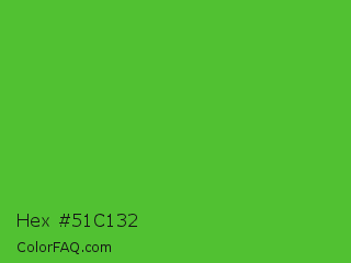 Hex #51c132 Color is a normal green color and the nearest color is Green RYB #66b032. Hex code #51c132 and RGB value is rgb(81,193,50). In RGB color space, this color is composed of 32% red, 76% green, 20% blue, In CMYK color space, this color is composed of 58% cyan, 0% magenta, 74% yellow , 24% black , In HSL color space, this color has a hue angle of 107° , 59% saturation and 48% lightness.