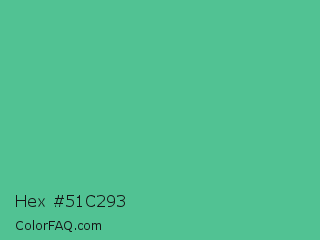 Hex #51c293 Color is a normal green color and the nearest color is Ocean Green #48bf91. Hex code #51c293 and RGB value is rgb(81,194,147). In RGB color space, this color is composed of 32% red, 76% green, 58% blue, In CMYK color space, this color is composed of 58% cyan, 0% magenta, 24% yellow , 24% black , In HSL color space, this color has a hue angle of 155° , 48% saturation and 54% lightness.