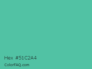 Hex #51c2a4 Color is a normal cyan color and the nearest color is Puerto Rico #3fc1aa. Hex code #51c2a4 and RGB value is rgb(81,194,164). In RGB color space, this color is composed of 32% red, 76% green, 64% blue, In CMYK color space, this color is composed of 58% cyan, 0% magenta, 15% yellow , 24% black , In HSL color space, this color has a hue angle of 164° , 48% saturation and 54% lightness.