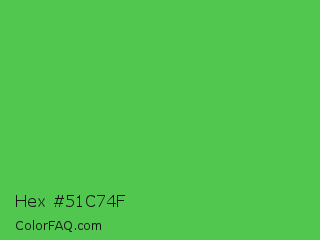 Hex #51c74f Color is a normal green color and the nearest color is Apple #4fa83d. Hex code #51c74f and RGB value is rgb(81,199,79). In RGB color space, this color is composed of 32% red, 78% green, 31% blue, In CMYK color space, this color is composed of 59% cyan, 0% magenta, 60% yellow , 22% black , In HSL color space, this color has a hue angle of 119° , 52% saturation and 55% lightness.