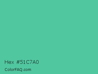 Hex #51c7a0 Color is a normal green color and the nearest color is Ocean Green #48bf91. Hex code #51c7a0 and RGB value is rgb(81,199,160). In RGB color space, this color is composed of 32% red, 78% green, 63% blue, In CMYK color space, this color is composed of 59% cyan, 0% magenta, 20% yellow , 22% black , In HSL color space, this color has a hue angle of 160° , 51% saturation and 55% lightness.