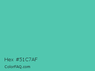 Hex #51c7af Color is a normal cyan color and the nearest color is Puerto Rico #3fc1aa. Hex code #51c7af and RGB value is rgb(81,199,175). In RGB color space, this color is composed of 32% red, 78% green, 69% blue, In CMYK color space, this color is composed of 59% cyan, 0% magenta, 12% yellow , 22% black , In HSL color space, this color has a hue angle of 168° , 51% saturation and 55% lightness.