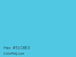 Hex #51c8e3 Color is a normal cyan color and the nearest color is Sea Serpent #4bc7cf. Hex code #51c8e3 and RGB value is rgb(81,200,227). In RGB color space, this color is composed of 32% red, 78% green, 89% blue, In CMYK color space, this color is composed of 64% cyan, 12% magenta, 0% yellow , 11% black , In HSL color space, this color has a hue angle of 191° , 72% saturation and 60% lightness.