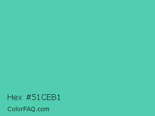 Hex #51ceb1 Color is a normal cyan color and the nearest color is Eucalyptus #44d7a8. Hex code #51ceb1 and RGB value is rgb(81,206,177). In RGB color space, this color is composed of 32% red, 81% green, 69% blue, In CMYK color space, this color is composed of 61% cyan, 0% magenta, 14% yellow , 19% black , In HSL color space, this color has a hue angle of 166° , 56% saturation and 56% lightness.