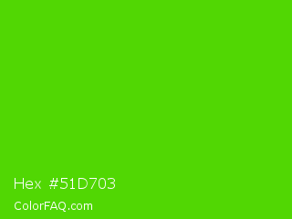 Hex #51d703 Color is a normal green color and the nearest color is Harlequin Green #46cb18. Hex code #51d703 and RGB value is rgb(81,215,3). In RGB color space, this color is composed of 32% red, 84% green, 1% blue, In CMYK color space, this color is composed of 62% cyan, 0% magenta, 99% yellow , 16% black , In HSL color space, this color has a hue angle of 98° , 97% saturation and 43% lightness.