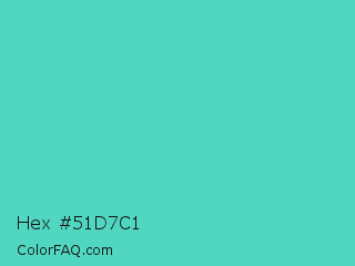 Hex #51d7c1 Color is a normal cyan color and the nearest color is Medium Turquoise #48d1cc. Hex code #51d7c1 and RGB value is rgb(81,215,193). In RGB color space, this color is composed of 32% red, 84% green, 76% blue, In CMYK color space, this color is composed of 62% cyan, 0% magenta, 10% yellow , 16% black , In HSL color space, this color has a hue angle of 170° , 63% saturation and 58% lightness.
