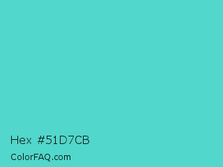 Hex #51d7cb Color is a normal cyan color and the nearest color is Medium Turquoise #48d1cc. Hex code #51d7cb and RGB value is rgb(81,215,203). In RGB color space, this color is composed of 32% red, 84% green, 80% blue, In CMYK color space, this color is composed of 62% cyan, 0% magenta, 6% yellow , 16% black , In HSL color space, this color has a hue angle of 175° , 63% saturation and 58% lightness.
