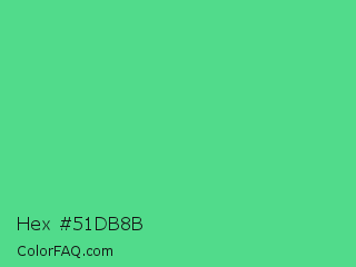 Hex #51db8b Color is a normal green color and the nearest color is Very Light Malachite Green #64e986. Hex code #51db8b and RGB value is rgb(81,219,139). In RGB color space, this color is composed of 32% red, 86% green, 55% blue, In CMYK color space, this color is composed of 63% cyan, 0% magenta, 37% yellow , 14% black , In HSL color space, this color has a hue angle of 145° , 66% saturation and 59% lightness.