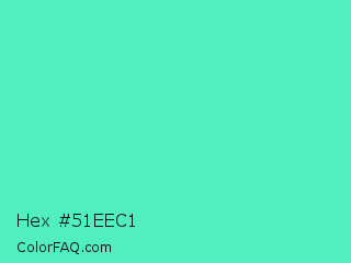 Hex #51eec1 Color is a light green color and the nearest color is Turquoise #40e0d0. Hex code #51eec1 and RGB value is rgb(81,238,193). In RGB color space, this color is composed of 32% red, 93% green, 76% blue, In CMYK color space, this color is composed of 66% cyan, 0% magenta, 19% yellow , 7% black , In HSL color space, this color has a hue angle of 163° , 82% saturation and 63% lightness.