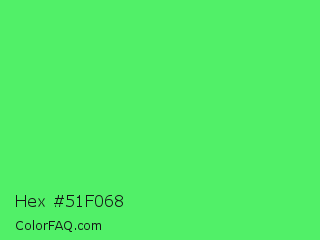 Hex #51f068 Color is a light green color and the nearest color is Screamin Green #66ff66. Hex code #51f068 and RGB value is rgb(81,240,104). In RGB color space, this color is composed of 32% red, 94% green, 41% blue, In CMYK color space, this color is composed of 66% cyan, 0% magenta, 57% yellow , 6% black , In HSL color space, this color has a hue angle of 129° , 84% saturation and 63% lightness.